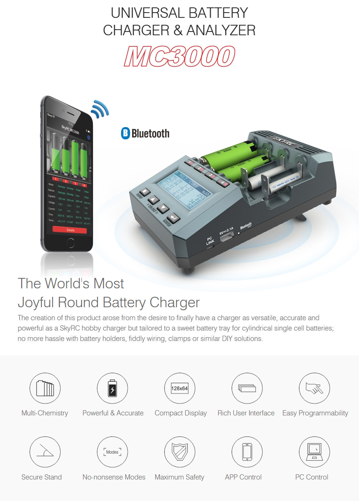Основними відмінними рисами від інших пристроїв є точність і стабільність роботи, великий струм заряду - 3А і розряду - 2А. Додані функції, як-от профілі заряду і розряду, що налаштовуються (понад 30 шт.), а також реалізовано повноцінне керування з ПК через USB-інтерфейс або за допомогою технології BLE4.0 через мобільні додатки. Користувач може самостійно змінювати напругу заряду, струм заряду, встановлювати межі відсічення. Зарядний пристрій SkyRC MC3000 забезпечує безпечне, а найголовніше якісне заряджання та розряджання різних типів акумуляторів: Li-FePo4, Li-ion, NiCd, NiZn, NiMH, Li-ion 4.35.